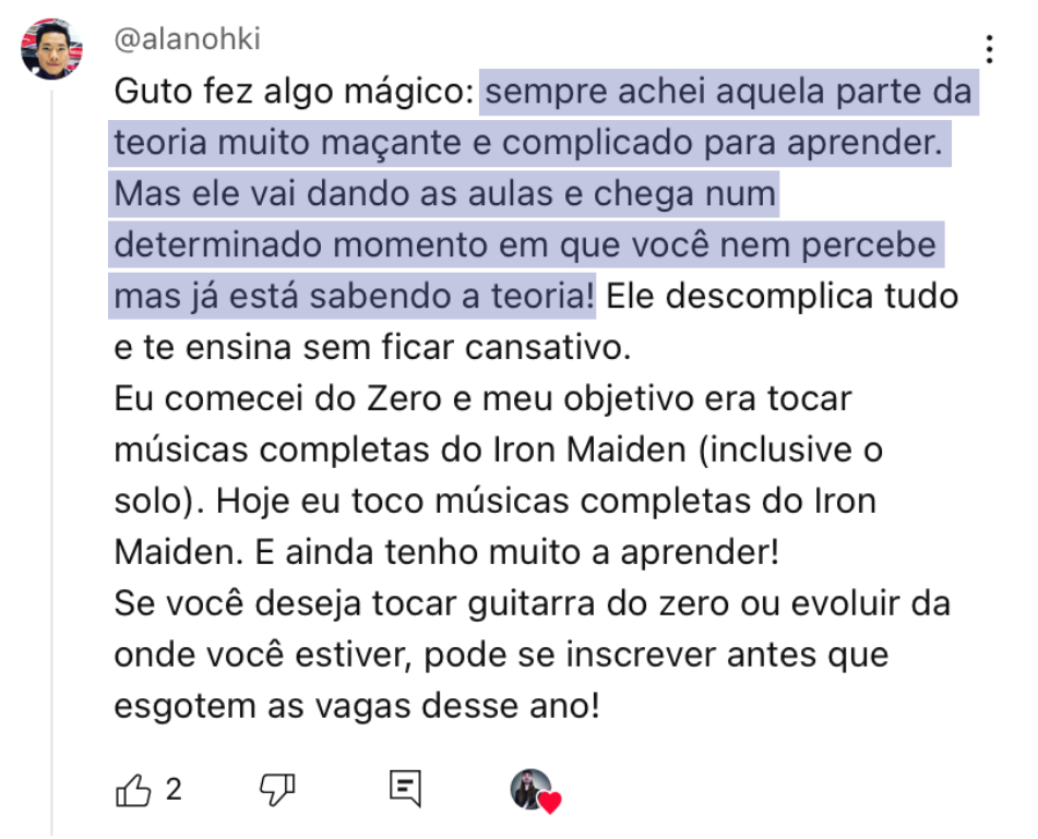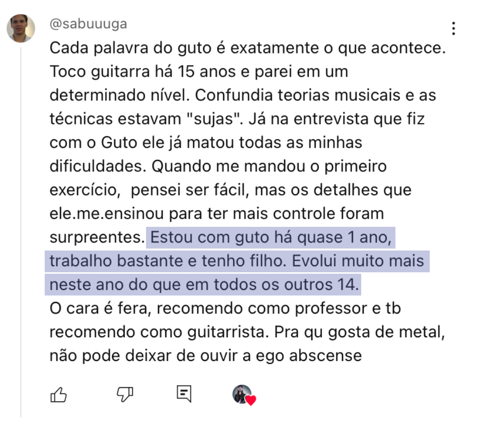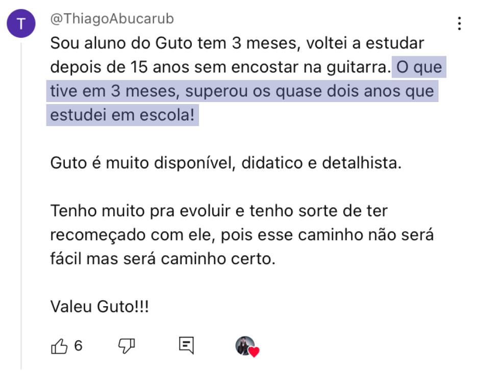 Mais do que um guitarrista experiente, Guto é um professor dedicado, conhecido por sua atenção aos detalhes, organização e pela capacidade de identificar exatamente o que o aluno precisa para evoluir. Já atuou em escolas de música, ministrou aulas presenciais e online em estúdio próprio e testou diversos formatos até chegar à Mentoria Guitar Mastery, que reúne o que há de mais eficaz e atual no aprendizado individualizado.