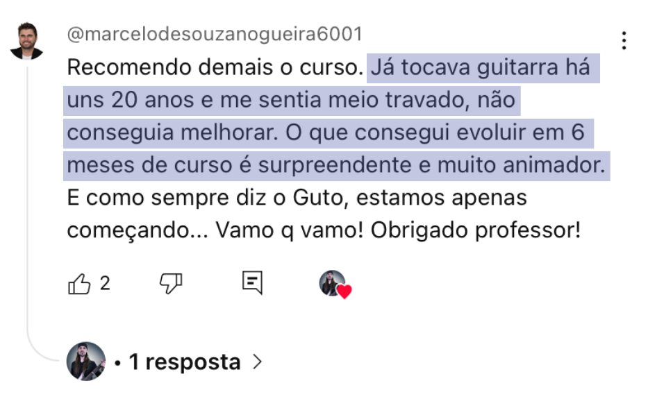 Você estará preparado para criar riffs, solos ou até músicas autorais, colocando em prática todo o conhecimento adquirido na mentoria para expressar sua criatividade. Você ficará surpreso com o que vai conseguir fazer!