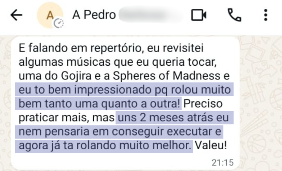 Uma videochamada em que o Guto avalia seu nível, dificuldades e objetivos na guitarra para montar o seu roteiro de estudos personalizado. A partir disso, começamos o ciclo das aulas: